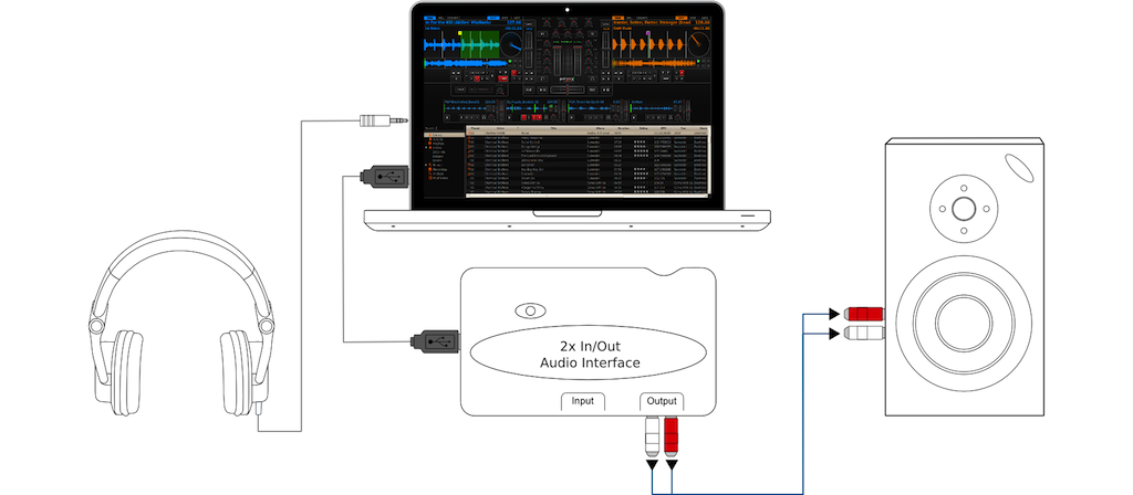 The most common setup for DJing is a laptop and a soundcard with 2 stereo outputs (4 channels). The first stereo output (channels 1-2) is used as the Master out and supplies the main mix to the room. With the 2nd stereo output (channels 3-4) you can cue and preview the next track in your headphones. If your soundcard does not have 2 stereo outputs, you can use multiple soundcards to achieve the same setup.