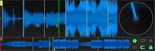 The big waveform summary shows the waveform envelope of the track near the current playback position and is updated in realtime. The mouse can be used on the waveform to pause, scratch, spin-back or throw the tracks. Right-clicking on the waveforms allows you to drag with the mouse to make temporary pitch adjustments.
