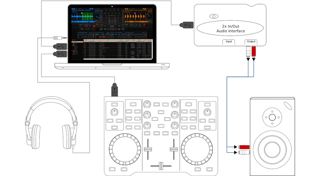 The most common setup for DJing is a laptop and a soundcard with 2 stereo outputs (4 channels). The first stereo output (channels 1-2) is used as the Master out and supplies the main mix to the room. With the 2nd stereo output (channels 3-4) you can cue and preview the next track in your headphones. If your soundcard does not have 2 stereo outputs, you can use multiple soundcards to achieve the same setup.