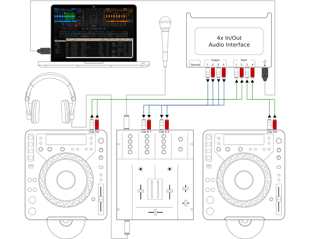 For turntables a typical setup is depicted in the figure below. First, connect the RCA cables from the turntables to the inputs on your sound card. Second, connect the outputs of your sound card to the inputs on your mixer.