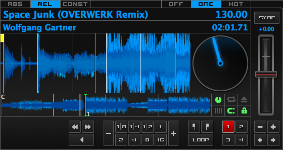 The big waveform summary shows the waveform envelope of the track near the current playback position and is updated in realtime. The mouse can be used on the waveform to pause, scratch, spin-back or throw the tracks. Right-clicking on the waveforms allows you to drag with the mouse to make temporary pitch adjustments.
