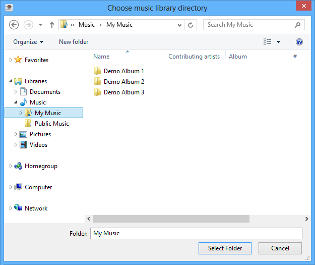Mixxx running on Windows 8 - Choose music library directory dialog¶