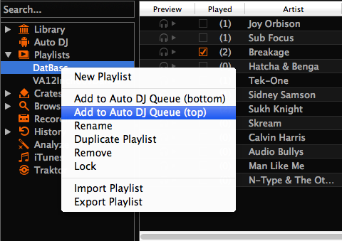 Select a regular playlist or crate, right-click with the mouse and select Add to Auto DJ from the mouse menu. This adds all tracks to Auto DJ.