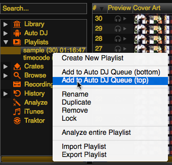 Select a regular playlist or crate, right-click with the mouse and select Add to Auto DJ from the mouse menu. This adds all tracks to Auto DJ.