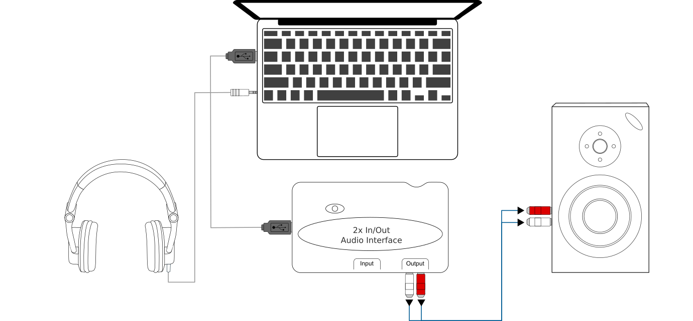 Controllers without an integrated audio interface can be used together with a USB audio interface as depicted in the diagram below: