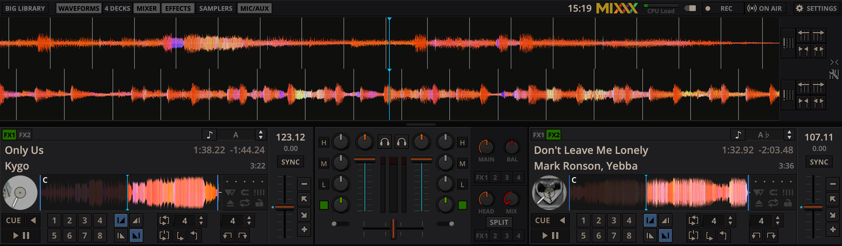 If you click on either WAVEFORMS, 4 DECKS, MIXER, EFFECTS, SAMPLERS or MICS & AUX then you will enable control sections for interacting with: