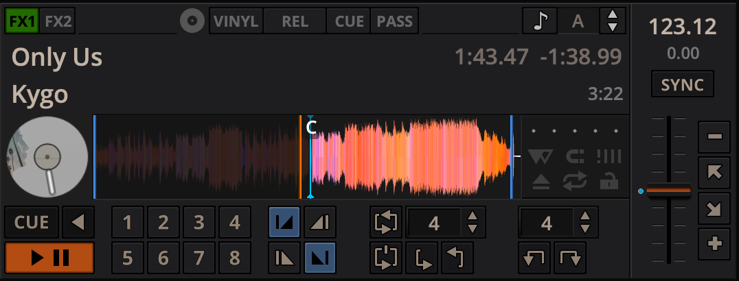 The FULL deck (which is similar in all skins) will show the Vinyl Control Mode and Cueing controls and Key controls at the top of the deck section and then the Hotcue Controls, Intro/Outro Markers, Loop Controls at the bottom.