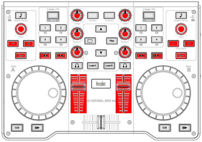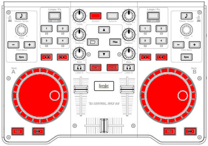 The Hercules DJ Control MP3 e2, MP3 LE, and Glow are USB controllers that have identical controls and share the same mapping. These controllers do not have a built in sound card, so a splitter cable or separate audio interface is recommended for use with it. The mapping is included in Mixxx and allows you to manipulate 4 decks, 2 at a time, switching Deck A (left) between Channel 1 and 3 and Deck B (right) between Channel 2 and 4.