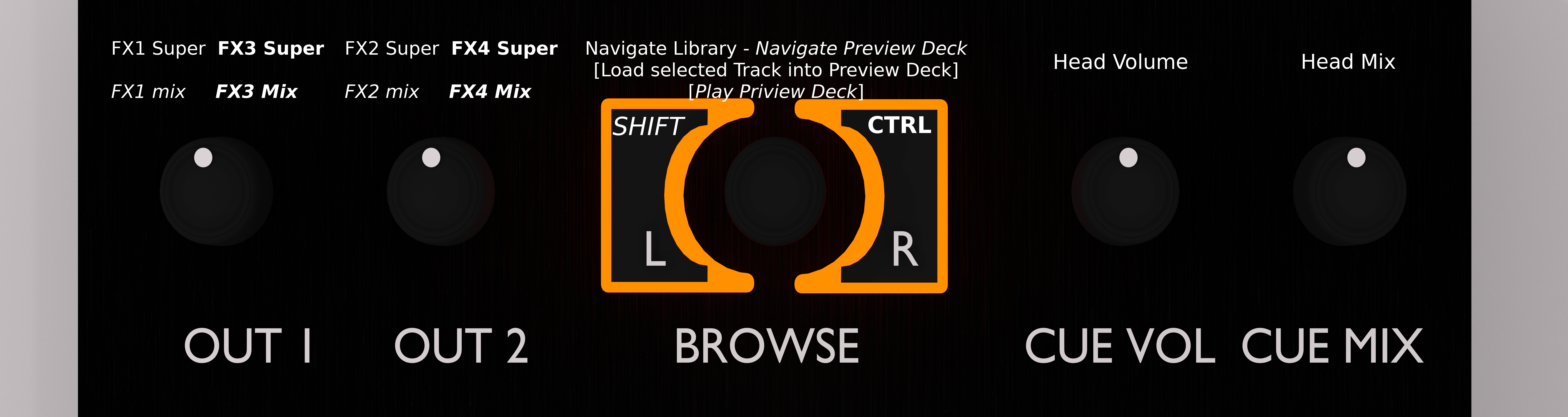 You can see the L/R buttons besides the encoder as [SHIFT] and [CTRL] buttons. These allow each button to have up to four functionalities. They behave like the Shift and Control keys on a computer keyboard.