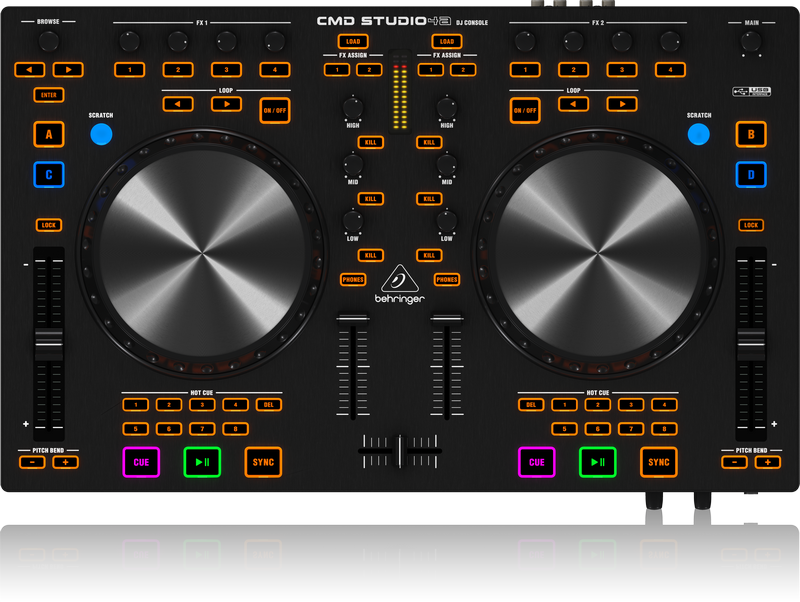 The Behringer CMD STUDIO 4a is a 2 deck controller that supports 4 virtual decks and has a built in 4 channel (one stereo master, one stereo headphones) USB sound card built in.