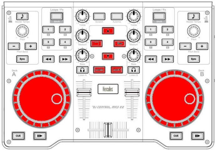 The Hercules DJ Control MP3 e2, MP3 LE, and Glow are USB controllers that have identical controls and share the same mapping. These controllers do not have a built in sound card, so a splitter cable or separate sound card is recommended for use with it. They are not class compliant MIDI devices. Older versions of Mixxx required using Hercules’ MIDI driver, but this driver can be a hassle to set up and maintain on Linux, so it is recommended only for Windows and Mac OS X. Another alternative is to use the user mode driver, or also upgrade to the latest version of Mixxx if you have not already. Support for using the MP3 LE and Glow as USB Bulk controllers without the driver on Linux is available in development versions of Mixxx and will be included in Mixxx 2.1, but the MP3 e2 was already supported in Mixxx 2.0.