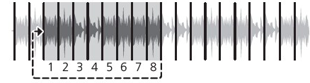 Starting with the first beat marked on a playing track, the track is divided into sections of 8 equal parts (not visible in waveform). If the first 8 parts are reached, the next section starts. The PADs are assigned to one section, each time the active section changes, the PADs will be assigned to the new active section (PAD 1..8 = section part 1..8). The section size is dependent of the selected slicer domain, changeable by pressing [SHIFT] + [PARAMETER LEFT] or [PARAMETER RIGHT]. The default slicer domain is 8 beats, so each part represents the part between one beat and the following beat. Possible slicer domains are 8, 16, 32, 64 beats.